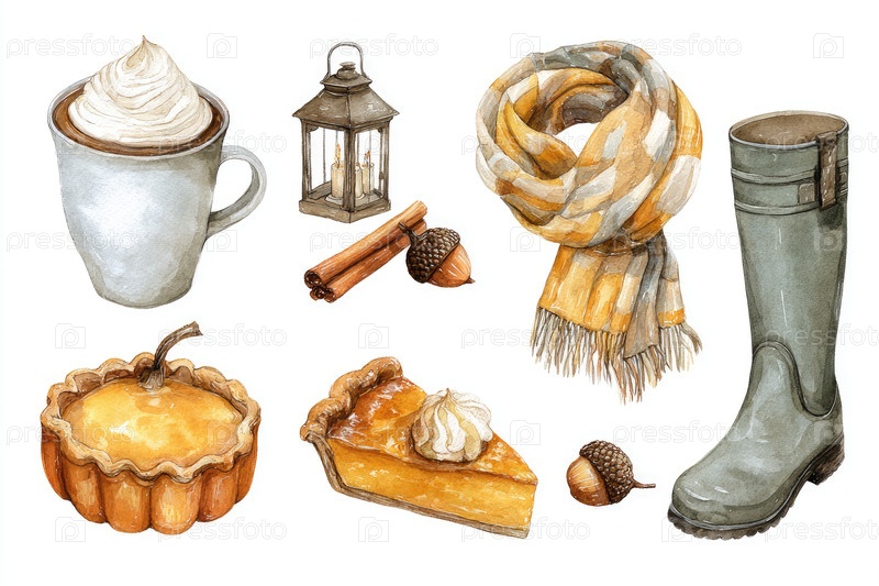 Осенняя тематическая акварельная иллюстрация с уютными объектами, такими как пирог, шарф, сапоги и фонарь идеально подходит для сезонного декора и теплоты