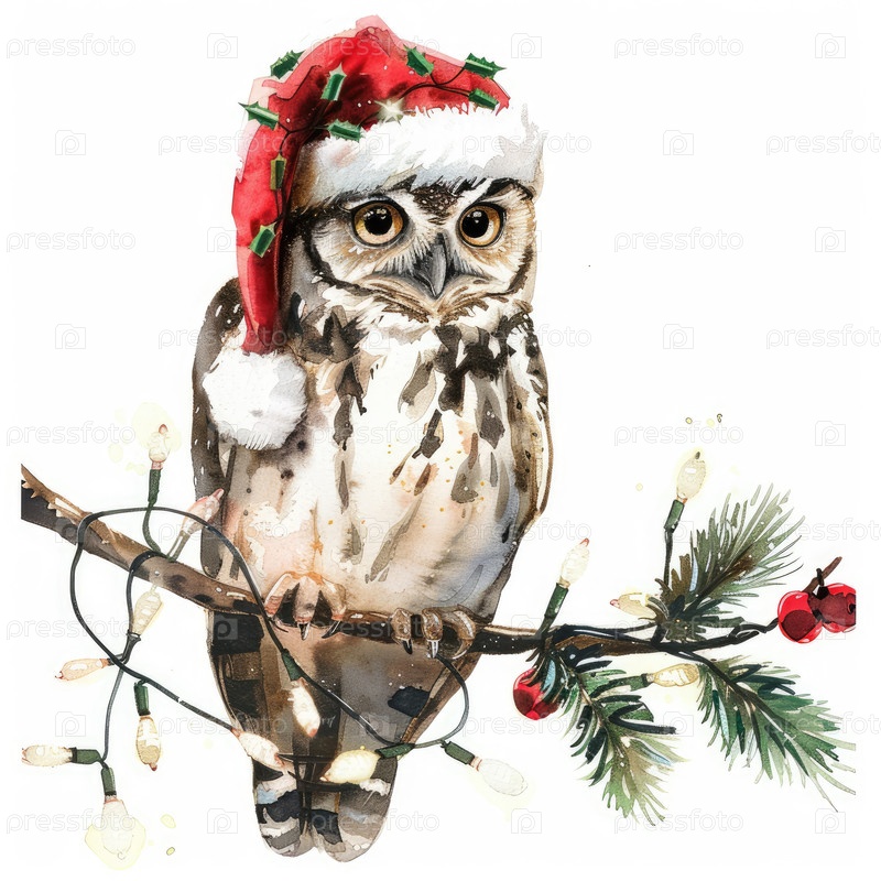 Праздничная сова, украшенная шляпой Санты, сидит на ветке в окружении мерцающих огней и праздничной зелени, создавая радостную атмосферу