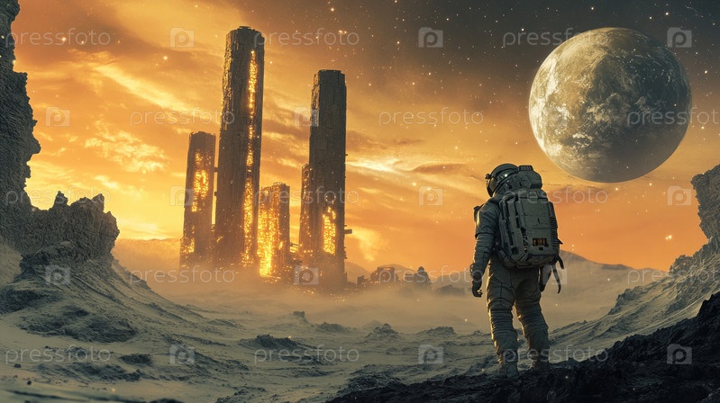 Астронавт стоит на каменистой местности, глядя на массивные структуры, освещенные закатом солнца с большой планетой, видимой в небе