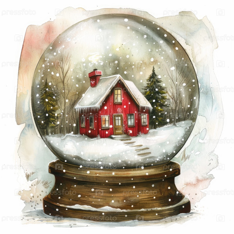 Иллюстрация снежного шара с очаровательным красным домом в окружении зимних пейзажей и деревьев