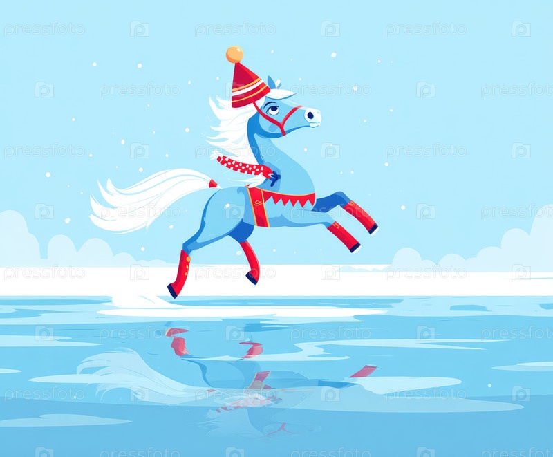Иллюстрация голубой лошади в праздничной одежде, галопирующей по замерзшему озеру с снежинками