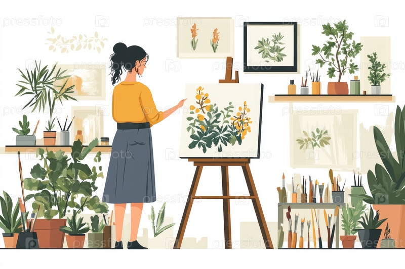 Художница рисует яркие цветы в уютной студии, окруженной пышными растениями и предметами искусства