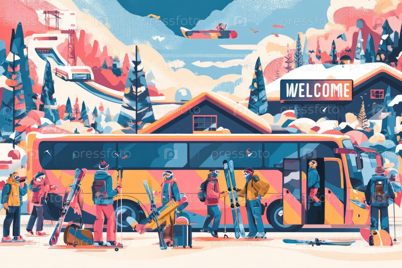 Красочная зимняя сцена со лыжниками, садящимися в автобус на покрытом снегом горном курорте с приветственной атмосферой