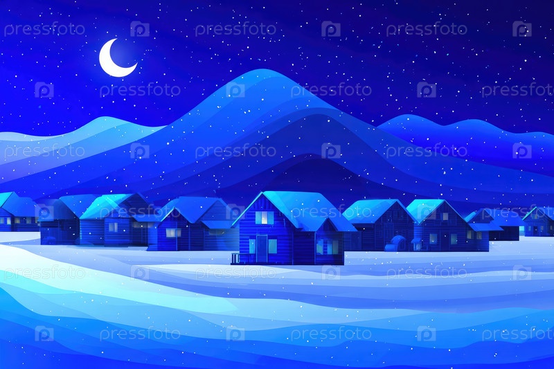 Зимняя ночная сцена с уютными домами под звездным небом и заснеженными горами на заднем плане
