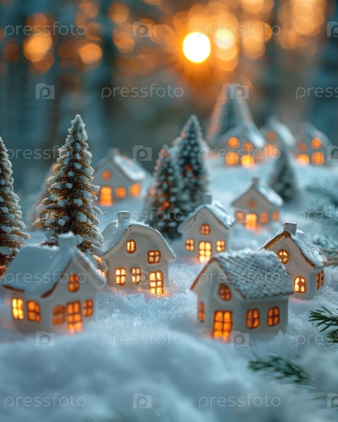 Зимняя деревенская сцена с освещенными домами и заснеженным пейзажем во время захода солнца