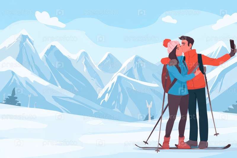 Пара наслаждается зимними каникулами, целуясь во время селфи в снежных горных пейзажах