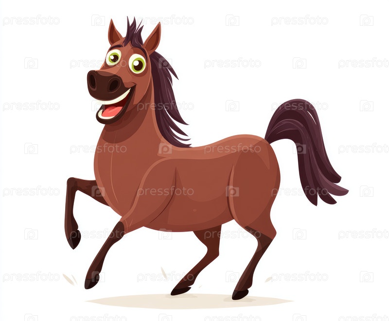 Веселая иллюстрация коричневой лошади с игривым выражением лица и яркими цветами в стиле мультфильмов