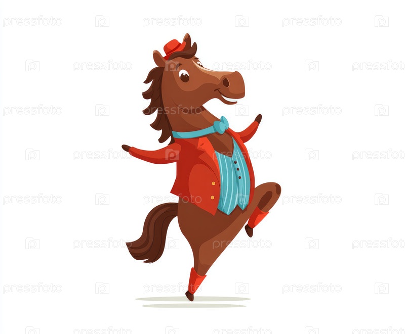 Веселый конный персонаж в ярком костюме, исполняющий танец с радостным выражением лица и живой позой