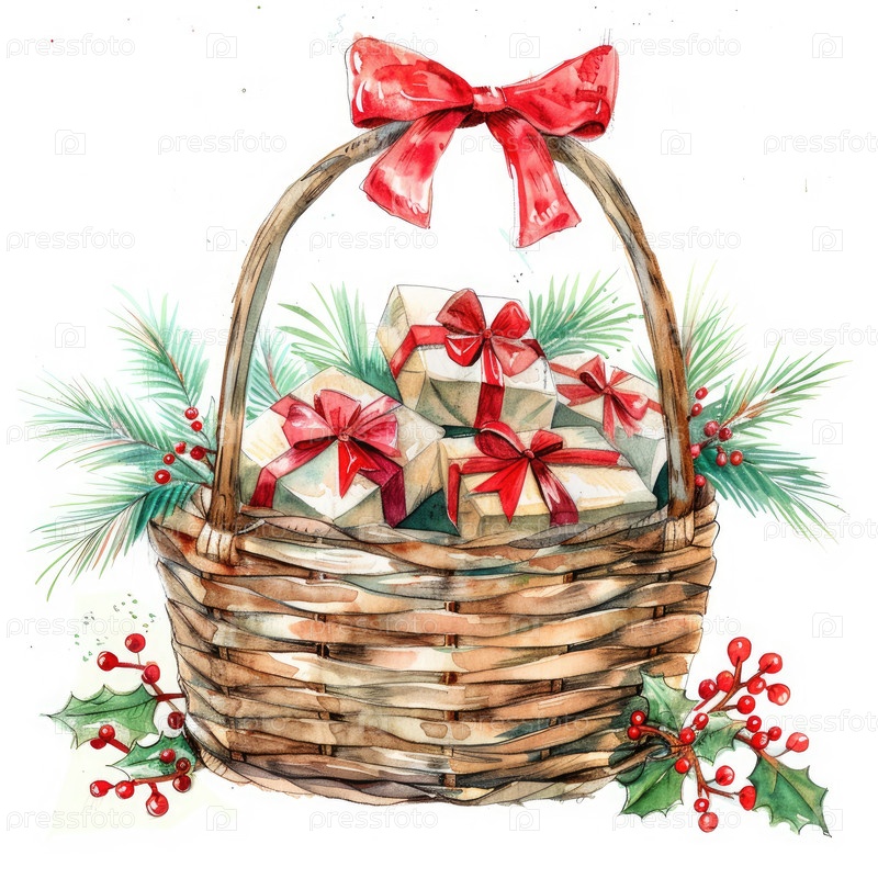 Праздничная корзина из плесеня, наполненная красиво упакованными подарками и праздничными зелеными акцентами