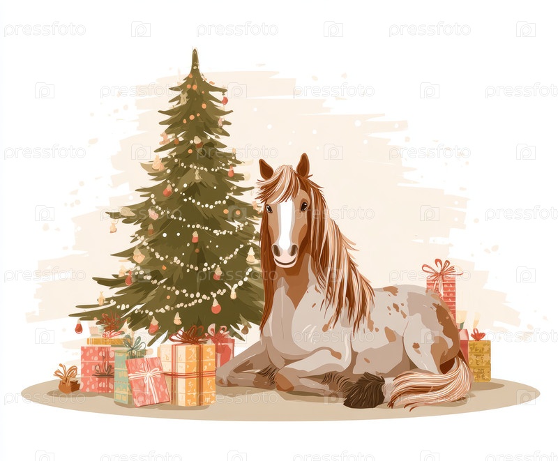 Праздничная лошадь отдыхает рядом с украшенной рождественской елкой, вокруг которой красочные подарки