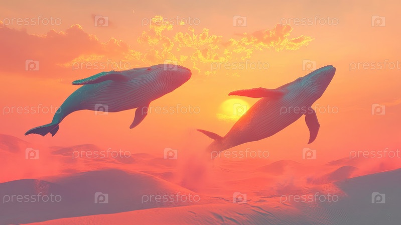 Два кита грациозно прыгают над океанскими волнами во время яркого заката с красочным небом