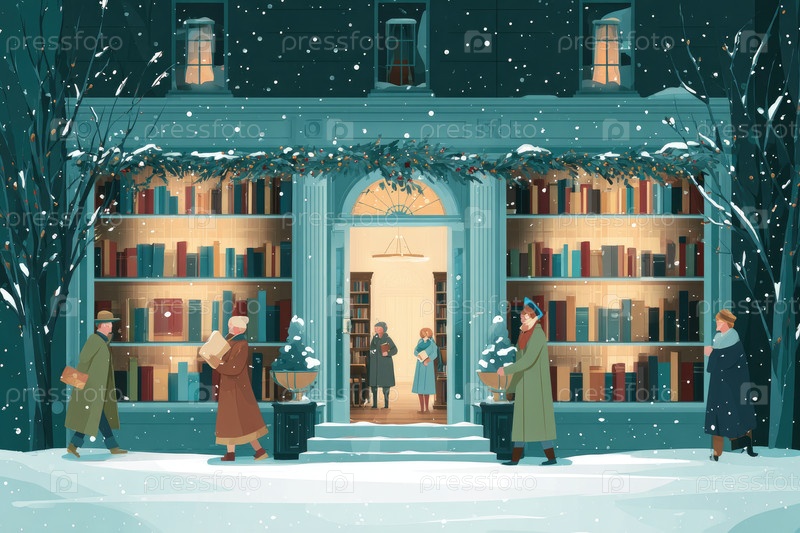 Зимняя сцена с разными людьми снаружи уютного книжного магазина, украшенного праздничными декорациями