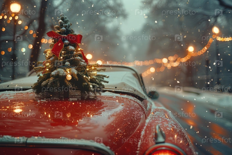 Винтажный красный автомобиль, украшенный рождественской елкой и огнями на снежной уличной сцене зимой
