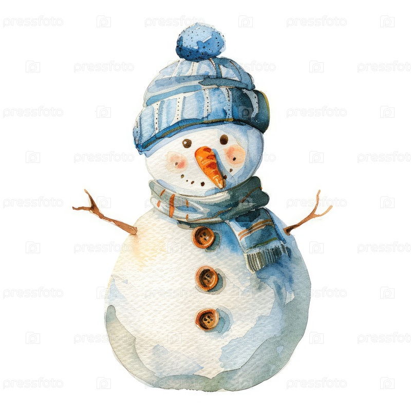Акварельная иллюстрация веселого снеговика в синей шляпе и шарфе с пуговицами
