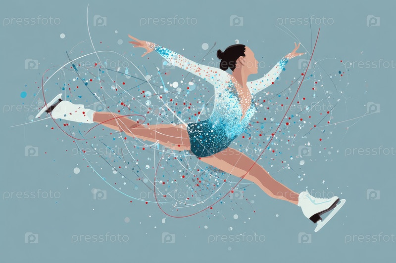 Женская фигуристка, выполняющая элегантный прыжок с красочными брызгами и динамическими линиями движения