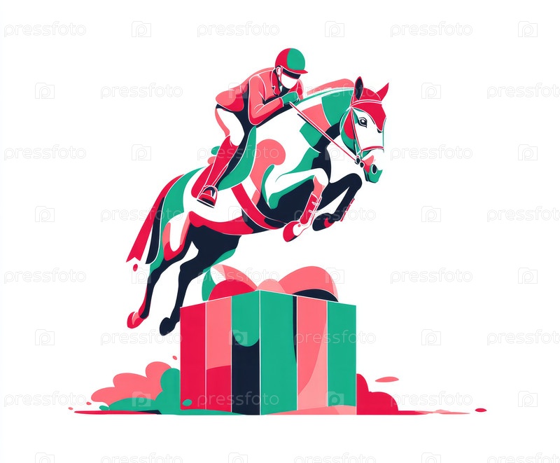 Всадник на лошади в ярком костюме, прыгающий через красочное препятствие в динамичном стиле иллюстрации