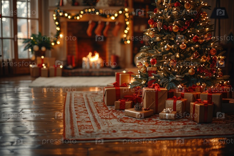 Праздничная рождественская елка украшена декорациями и окружена красиво упакованными подарками