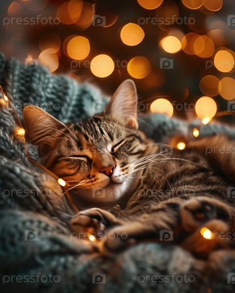 Кот Тэбби тихо спит на уютном одеяле, окруженный теплыми светящимися огнями