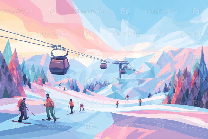 Красочный зимний пейзаж с лифтом и лыжники, наслаждающиеся снежными горными пейзажами