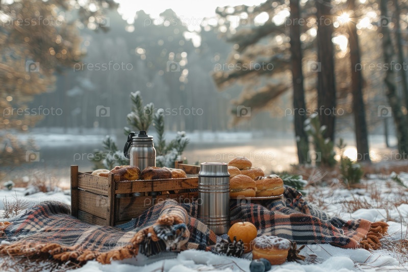 Уютный пикник на открытом воздухе с вкусными закусками и теплыми напитками в снежном лесу