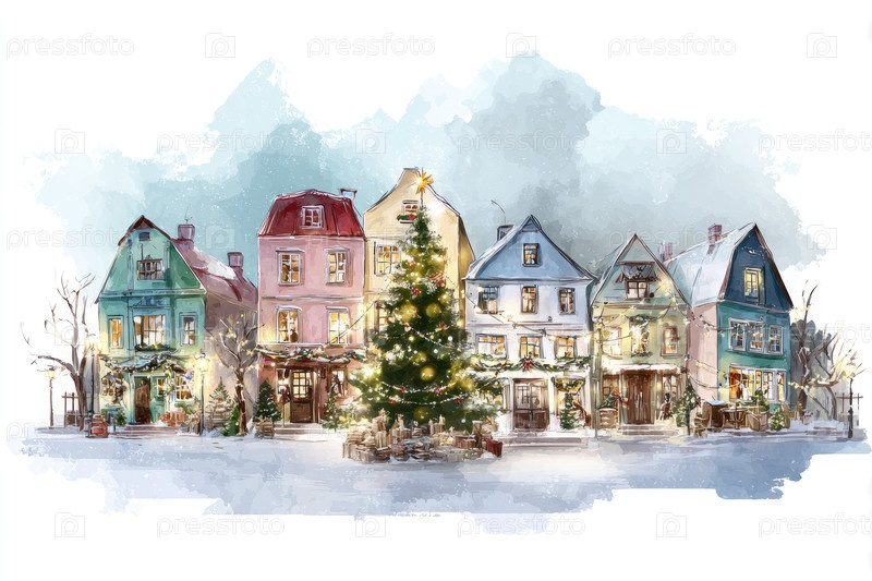 Красочная иллюстрация зимней деревни со снежными домами и украшенной рождественской елкой