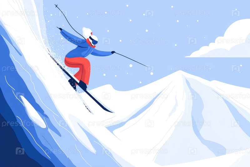 Динамичный лыжник в ярком костюме перерезает свежий порошок на снежном склоне горы