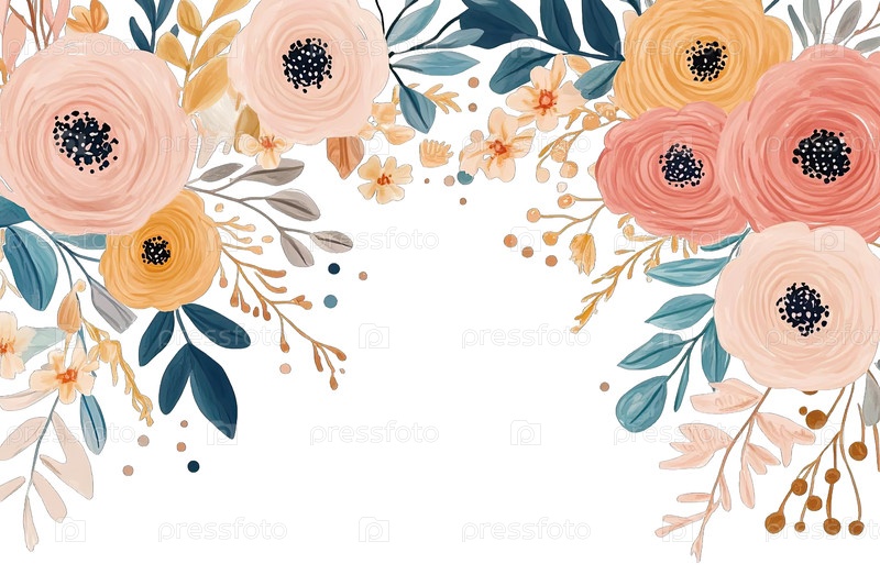 Красивая цветовая композиция с мягкими пастельными цветами и нежными листьями, создающая очаровательную и привлекательную атмосферу, идеально подходит для приглашений, поздравительных открыток или декоративных целей