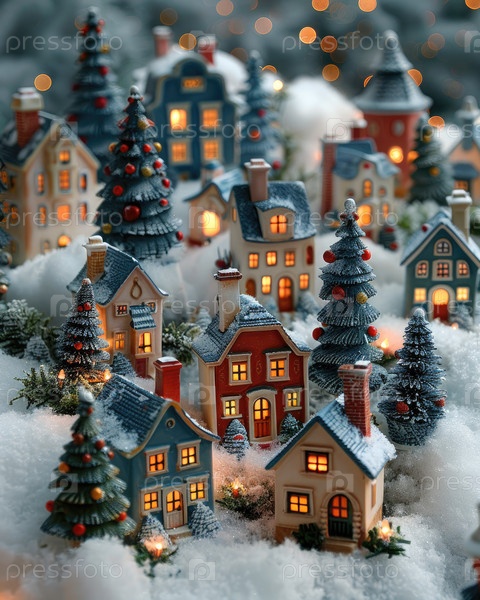 Очаровательная миниатюрная зимняя деревенская сцена с красочными домами в мягком снегу, освещенными окнами, создающими теплую атмосферу, окруженные вечнозелеными деревьями и мерцающими огнями, улучшающими праздничную атмосферу