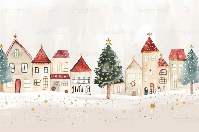 Красочная иллюстрация зимней деревни с очаровательными домами с праздничными крышами, в окружении украшенных рождественских ёлок на мягком снежном фоне, создавая уютную атмосферу праздника