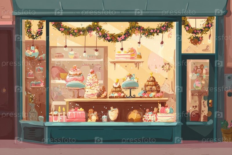 Красочное окно пекарни, наполненное множеством вкусных пирогов, тортов и праздничных украшений, создает теплую и гостеприимную атмосферу для прохожих, чтобы насладиться сладостями