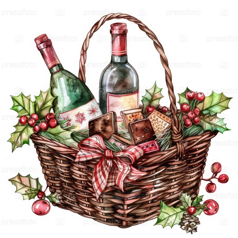 Праздничная корзина из плесеня демонстрирует две бутылки вина, различные гурманские закуски и яркие праздничные декорации, создавая теплую и гостеприимную атмосферу, идеально подходящую для сезонных торжеств