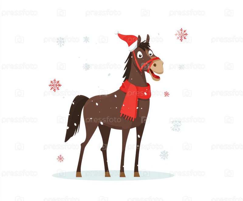 Веселая лошадь, украшенная шляпой Санты и красным шарфом, стоит в снежной зимней стране чудес, окруженной падающими снежинками, создавая радостную и праздничную атмосферу для праздничного сезона
