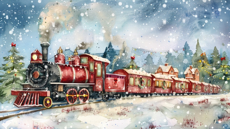 Винтажный паровоз, дрожащий вдоль заснеженной тропы, окружённый соснами и праздничными украшениями, вызывает ностальгическую зимнюю сцену, наполненную теплом и праздничным настроением