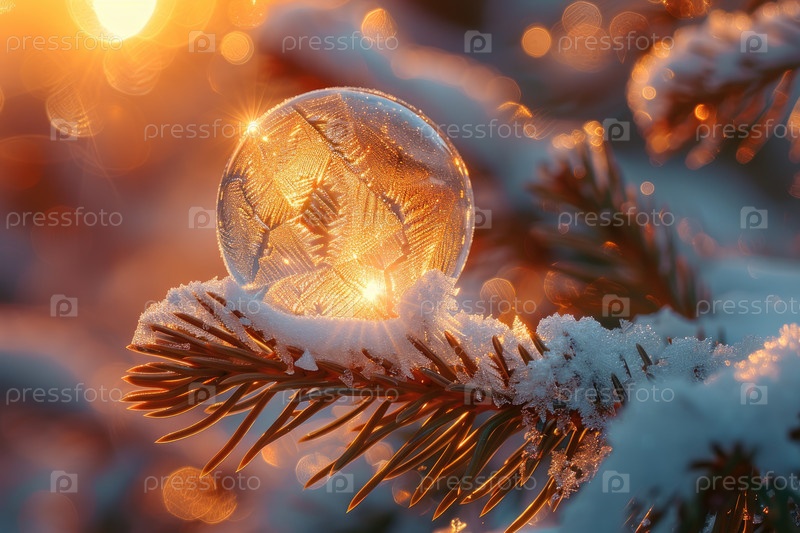 Замороженное стекло деликатно размещается на снежном сосновом ветке, освещенном теплым солнечным светом, создавая волшебную зимнюю атмосферу с искрящейся стороной в фоне