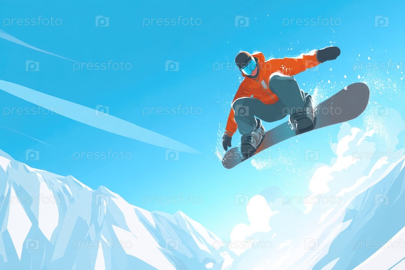 Сноубордист в оранжевом куртке выполняет воздушный трюк среди снежных гор