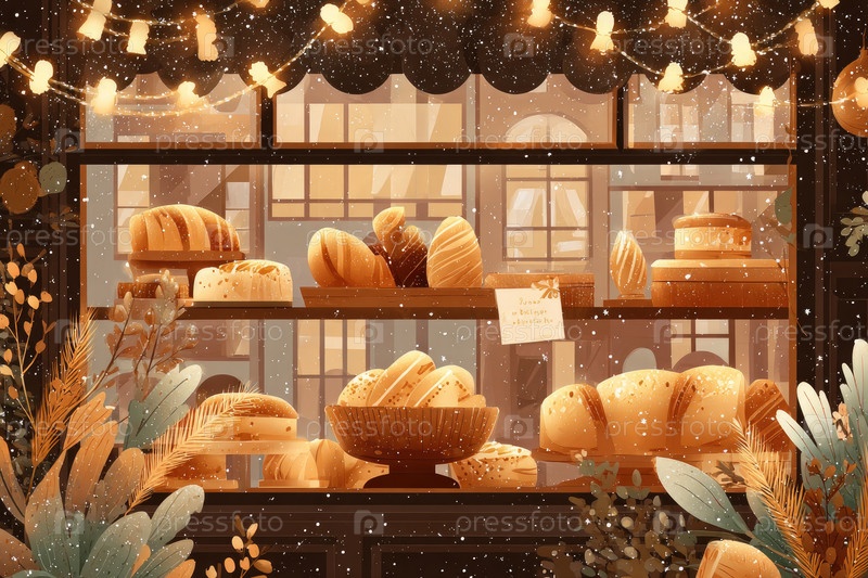 Выставка пекарни с различными хлебами и выпечкой в теплой, привлекательной атмосфере со светом