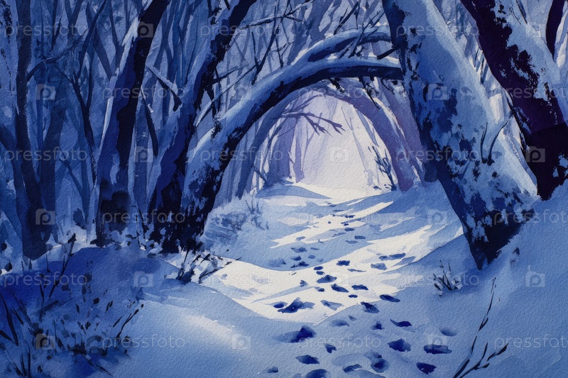Иллюстрация зимнего пейзажа со снежной тропой сквозь темные деревья и спокойной атмосферой