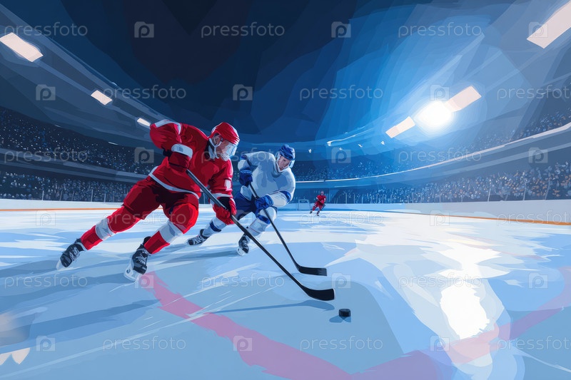 Динамичные хоккеисты напряженно соревнуются на катке во время захватывающей игровой атмосферы