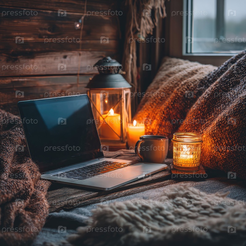 Уютное рабочее пространство с ноутбуком, теплыми одеялами, свечами и фонариком создает спокойную атмосферу