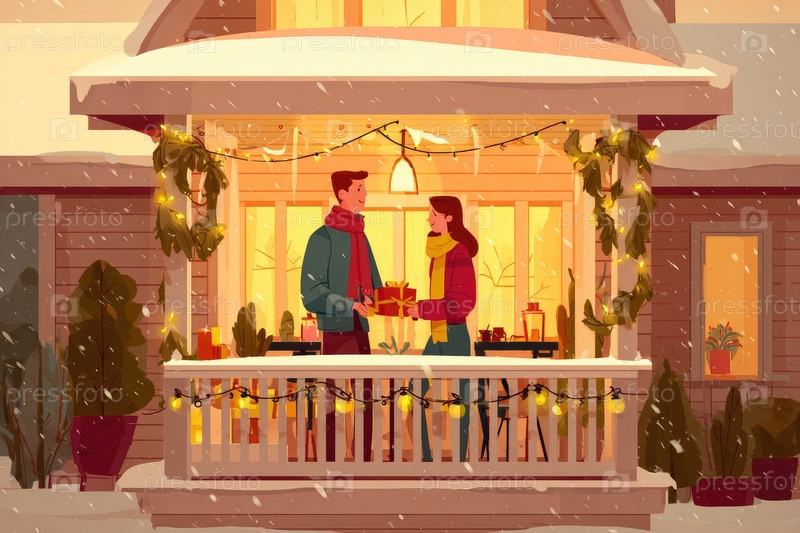 Пары обмениваются подарками на снежном крыльце, украшенном огнями во время зимнего сезона праздников