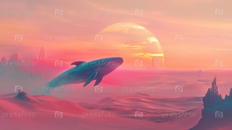Сюрреалистическая иллюстрация кита, парившего над ярким пустынным пейзажем под светящимся солнцем