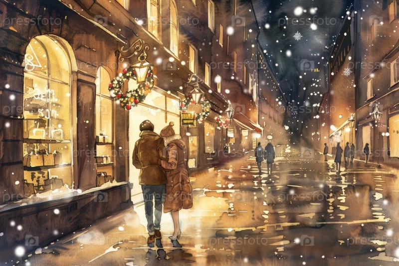 Пара идет по заснеженной улице с праздничными украшениями и теплыми огнями в зимний вечер