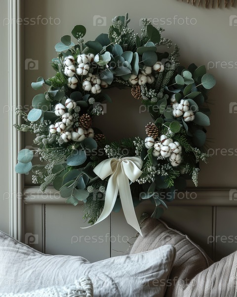 Декоративный венок с цветками хлопка, соснами и листьями эвкалипта для сезонного домашнего декора
