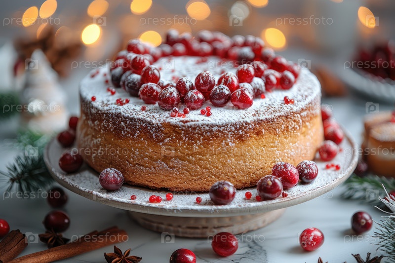 Праздничный торт, украшенный клюквами и сахарным порошком на деревенском деревянном столе