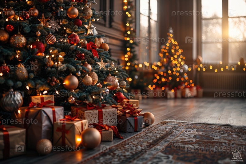 Праздничная рождественская сцена с украшенными деревьями, светящимися огнями и красиво упакованными подарками