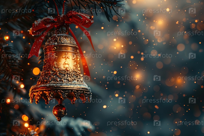 Украшенное украшение рождественских колоколов висит на сосновой ветке с искрящимися огнями в фоне