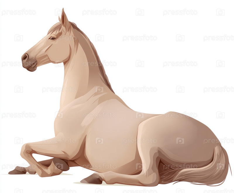 Расслабленная бежевая лошадь, лежащая в спокойной позе на белом фоне для художественного представления