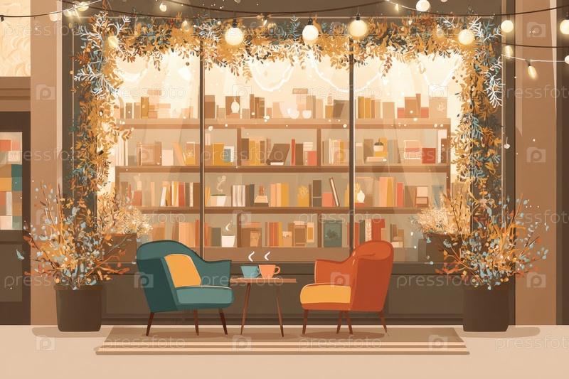 Уютный уголок для чтения на открытом воздухе с красочными стульями и освещенными книжными полками в осенней обстановке
