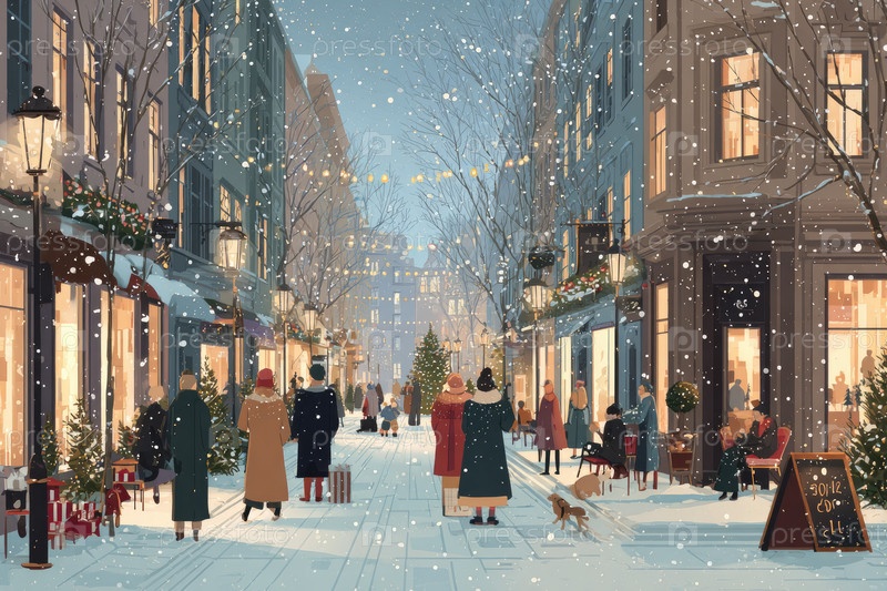 Зимняя уличная сцена с ходящими людьми, падающим снегом и праздничными украшениями в городской обстановке