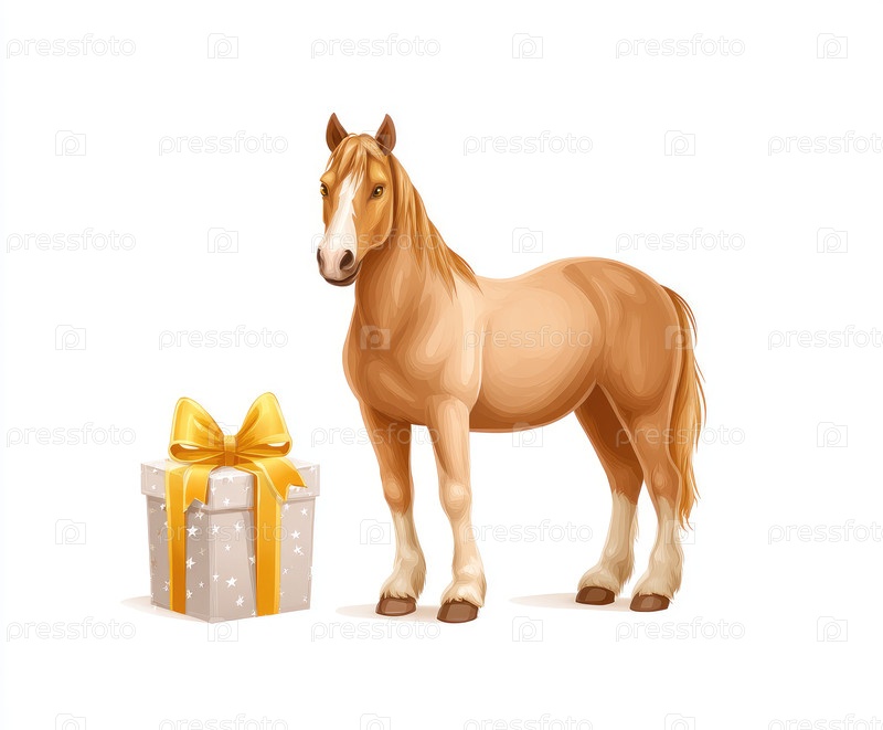 Коричневый конь стоит рядом с красиво упакованной подарочной коробкой со золотой ленточкой